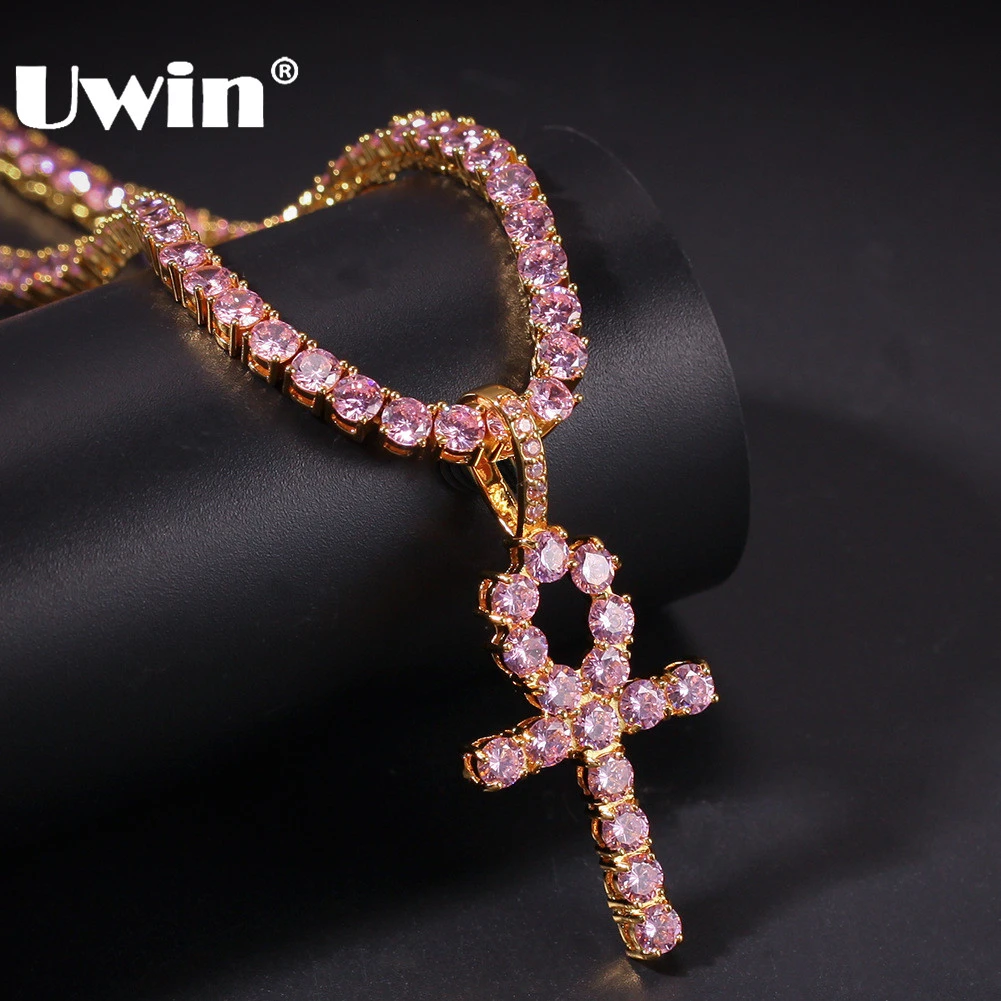 New UWIN 4mm Pink Iced Ankh Cross Pendant Cubic Zirconia Tennis Chains Gold Silver Color Necklace Color