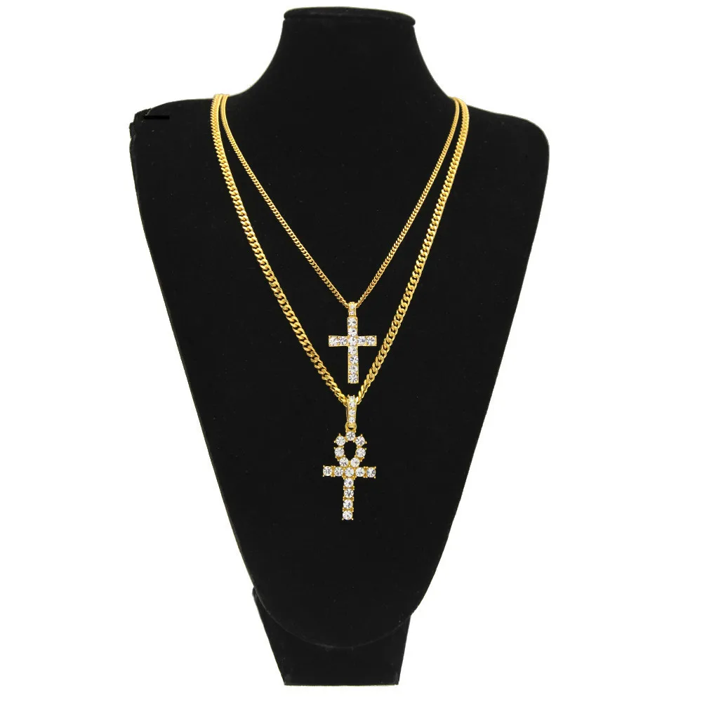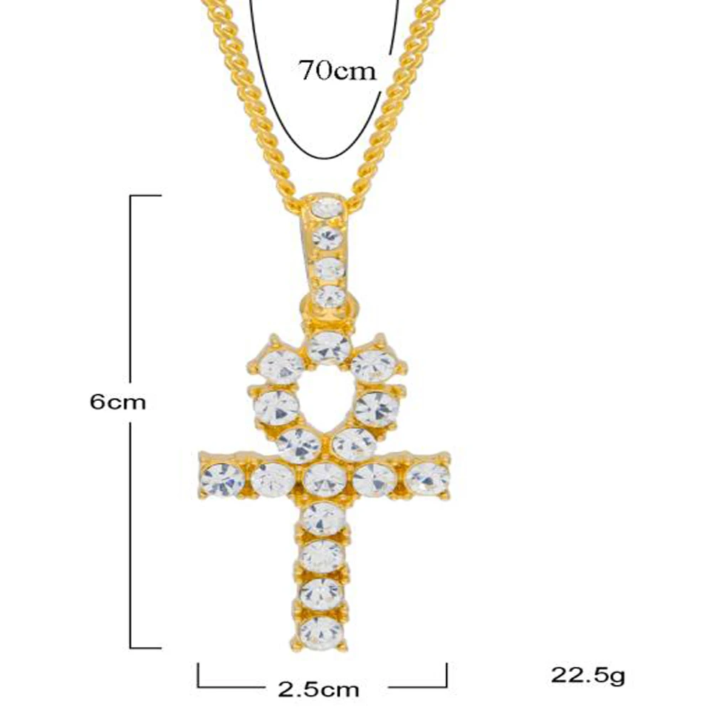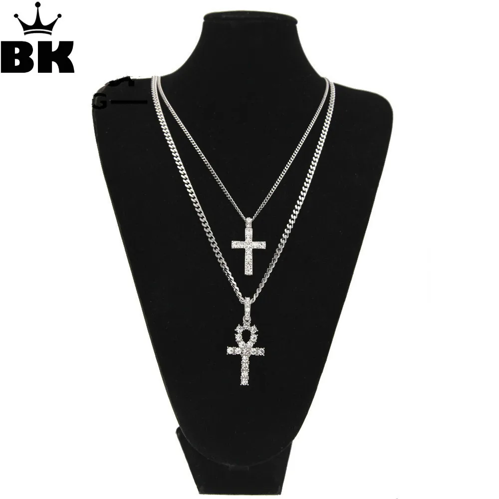 Promo Mens Silver Plated Iced Out Rhinestone Cross-Pendant Necklace Cross & Ankh Key of Life Jewelry With