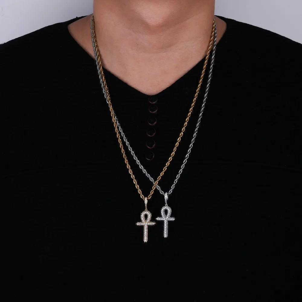 New Solid Back Ankh Cross Necklaces Mens Women Hip Hop Gold Silver Color Pendant Necklace Iced Out AAA+