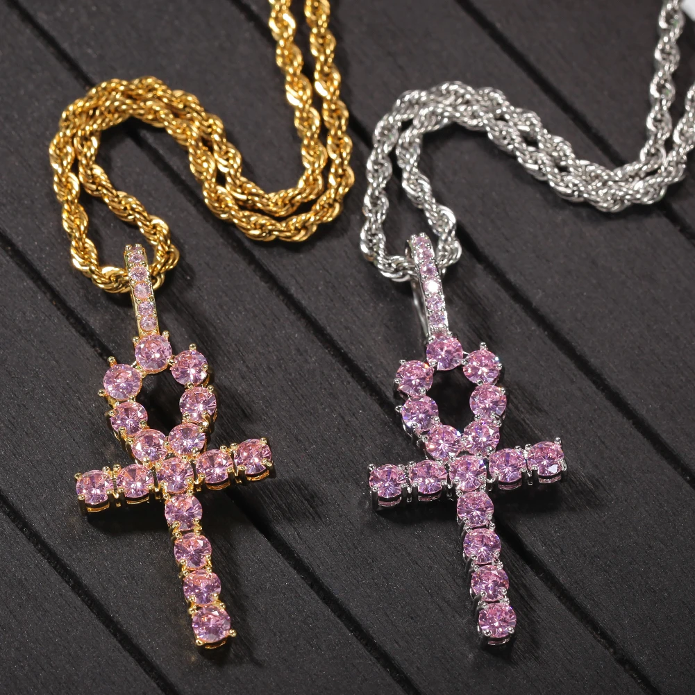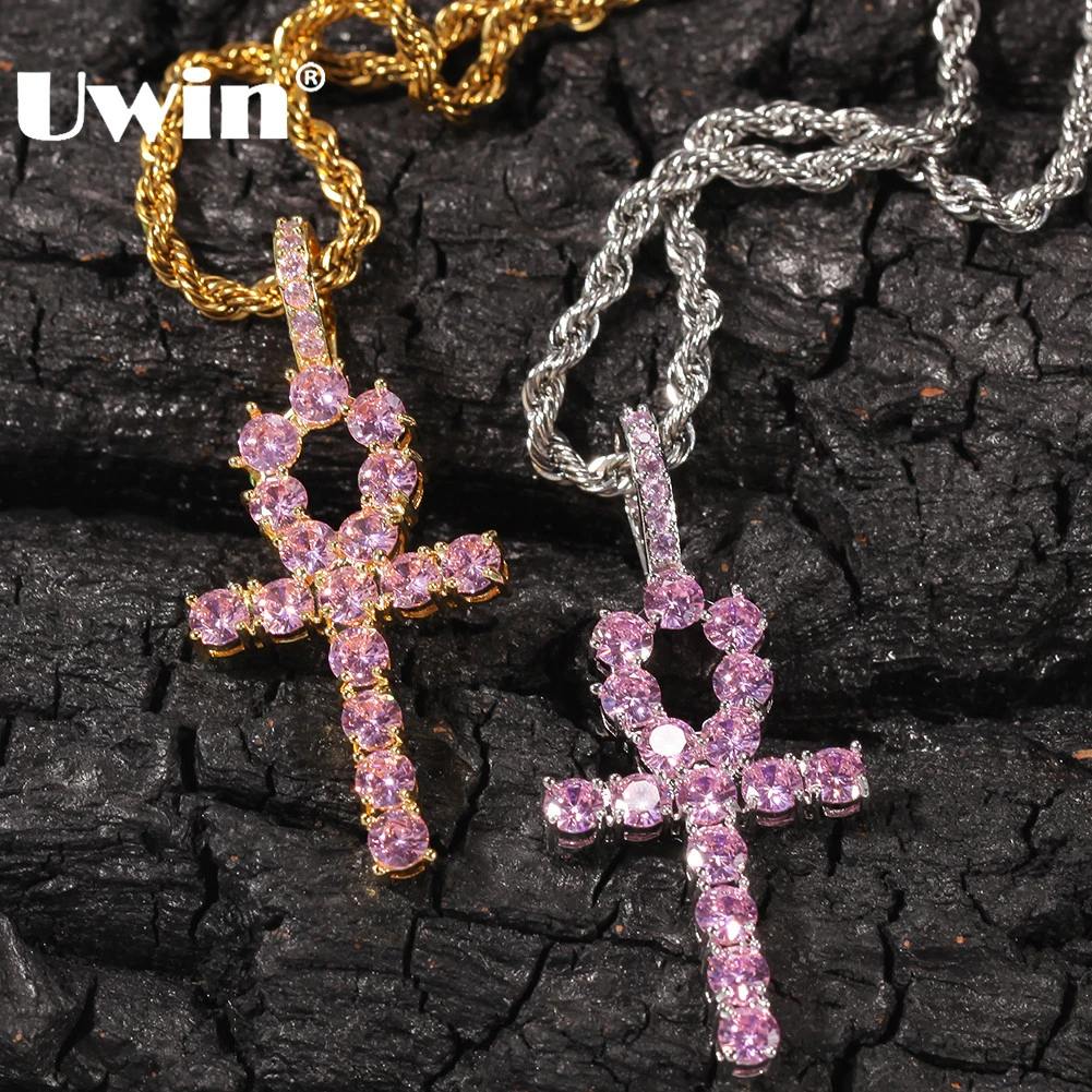New UWIN Women Ankh Cross Pendant PINK Iced Cubic Zirconia Stones Gold Silver Color Necklace Colored Fa