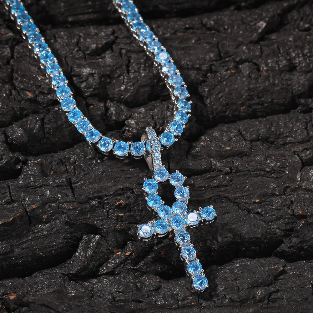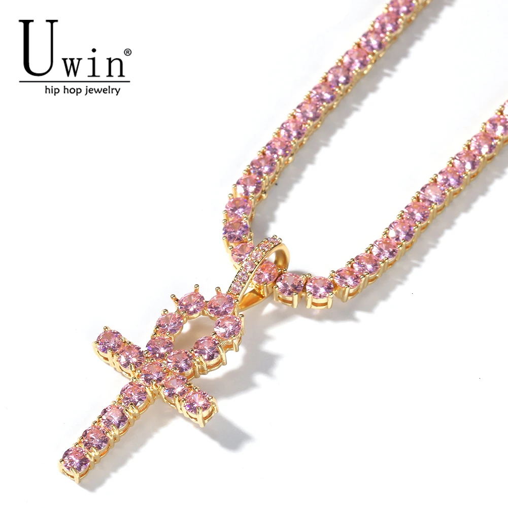 Best Uwin Pink Baby Blue CZ Tennis Chain With Ankh Cross Pendant 4mm Cubic Zirconia Gold Silver Necklace