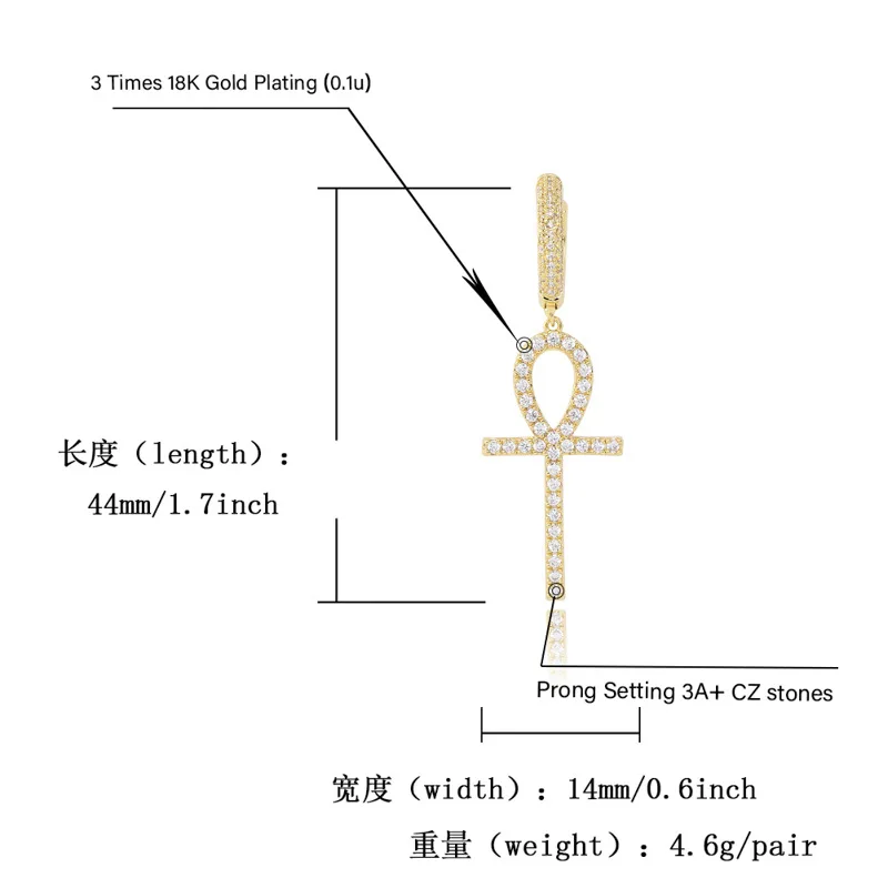 Promo Hip Hop Full AAA CZ Stone Bling Ice Out Ankh Cross Earring for Men Women CZ Stud Earrings Male Fash