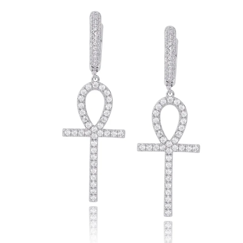 New Hip Hop Full AAA CZ Stone Bling Ice Out Ankh Cross Earring for Men Women CZ Stud Earrings Male Fash