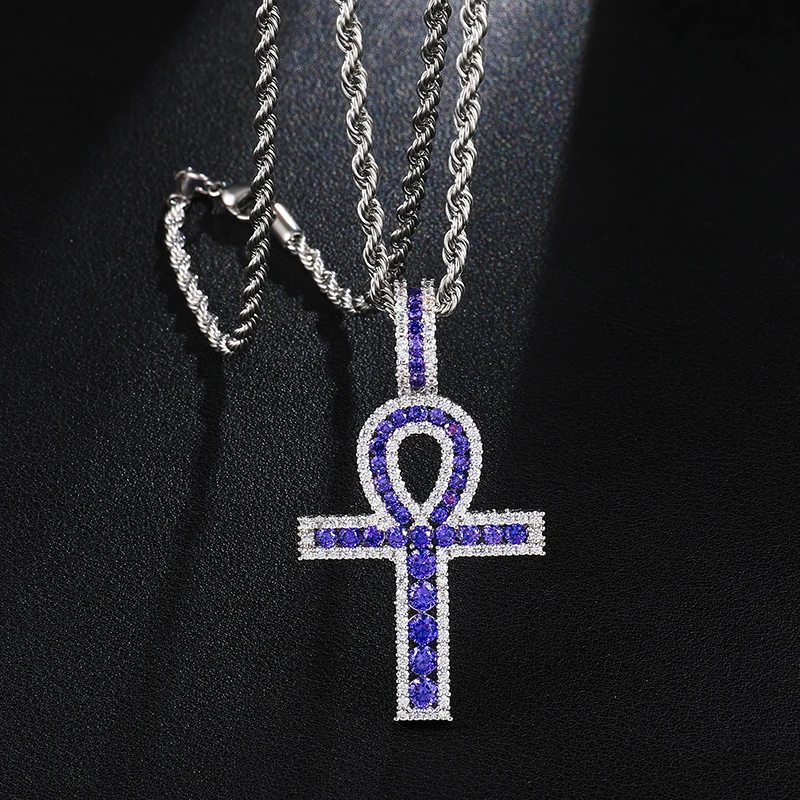 New US7 Bling Purple Zircon Ankh Cross Pendant Necklace Egyptian Key to Life Necklaces Men Hip Hop Jewe