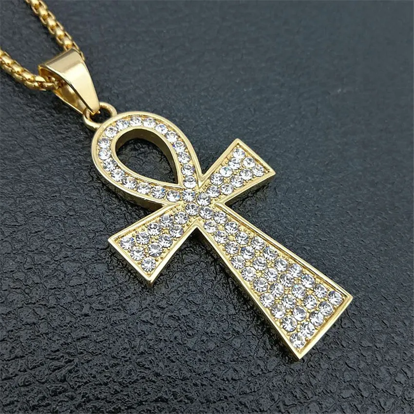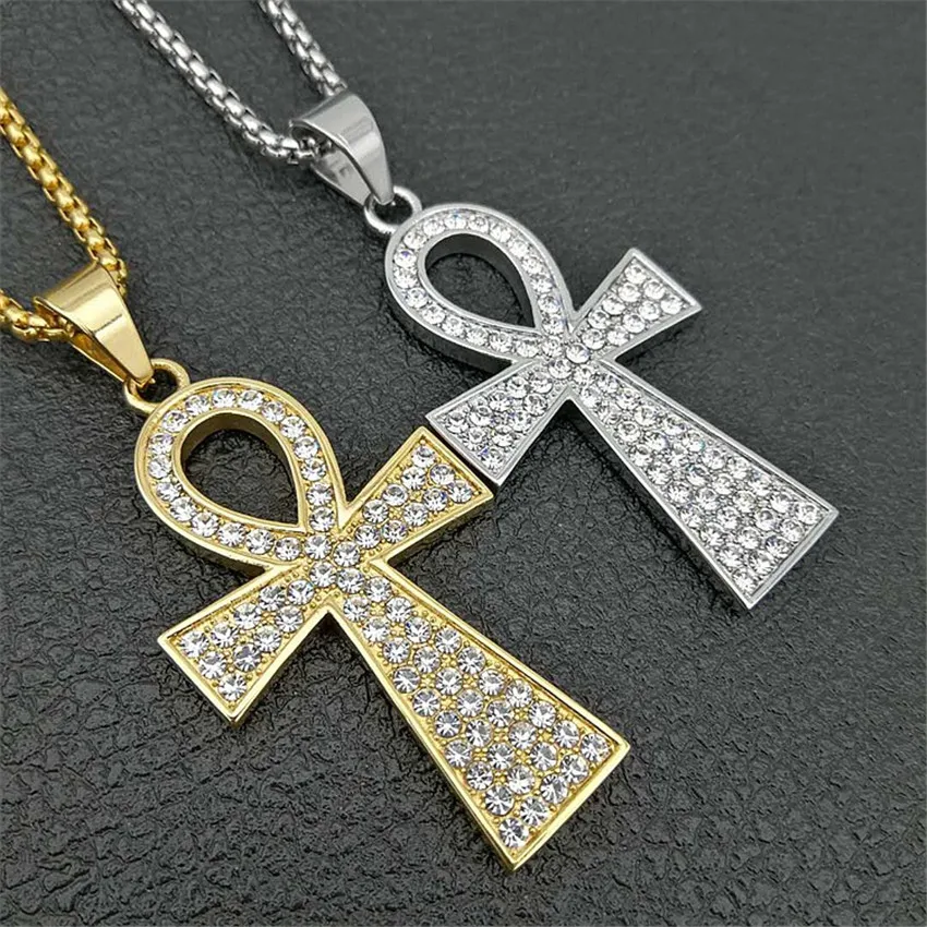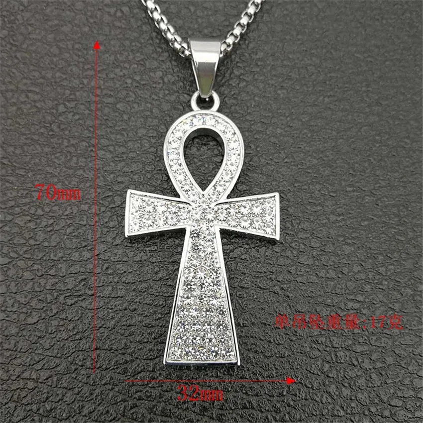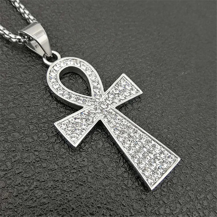 New Egypt Cross Ankh Pendant With Stainless Steel Chain and Iced Out Bling Rhinestones Necklace Hip Hop