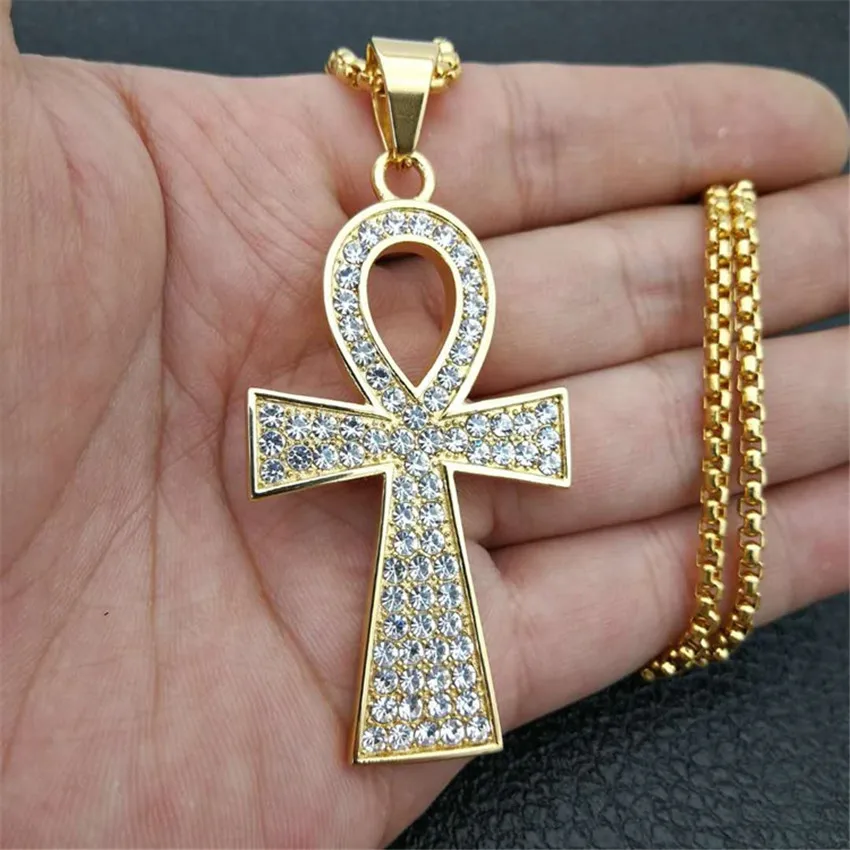 Promo Egypt Cross Ankh Pendant With Stainless Steel Chain and Iced Out Bling Rhinestones Necklace Hip Hop