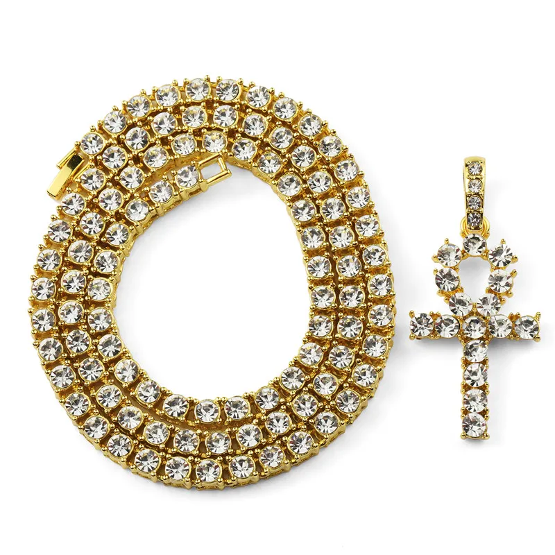 Promo 1 Row Rhinestone Ankh Keys Crossing Crystal Pendants Men Golden Bling Chokers Crystal Hip Hop Women