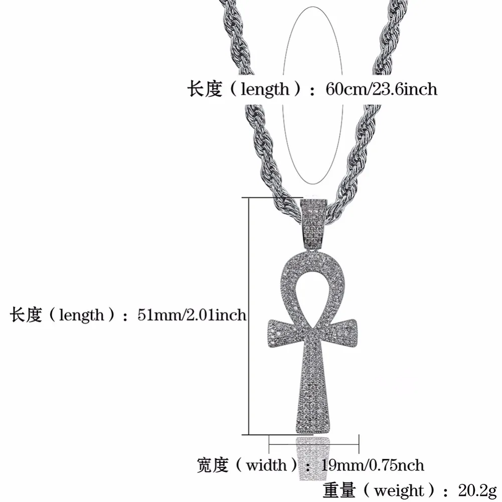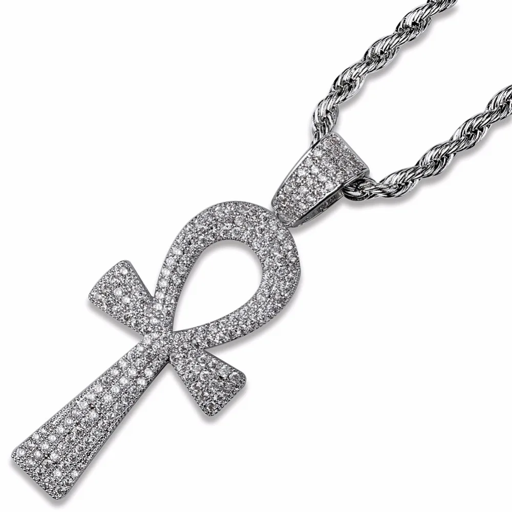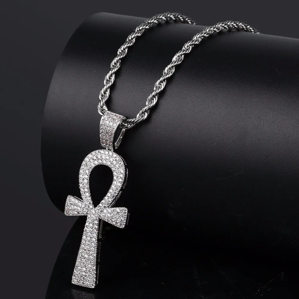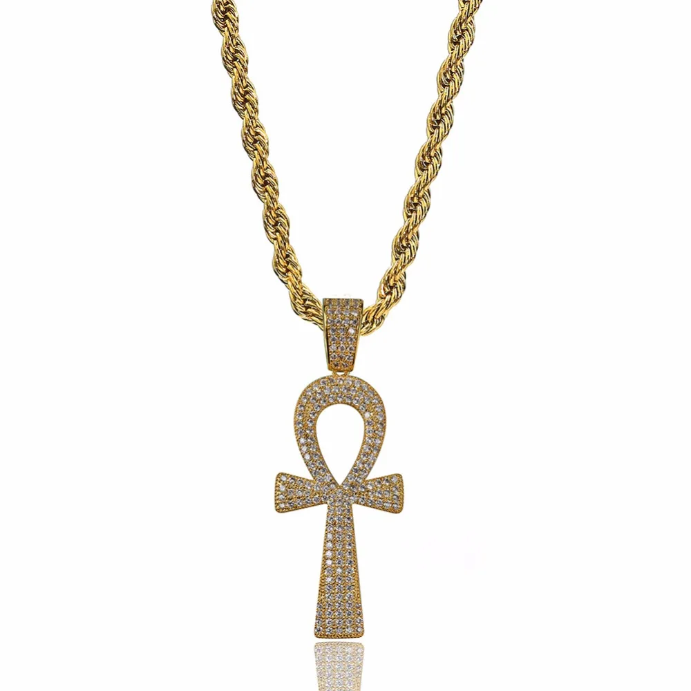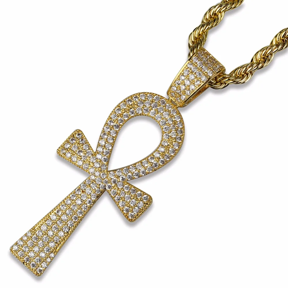 New Full Rhinestone Paved Bling Ice Out Egyptian Ankh Cross Pendants Necklaces Gold Silver Color Copper
