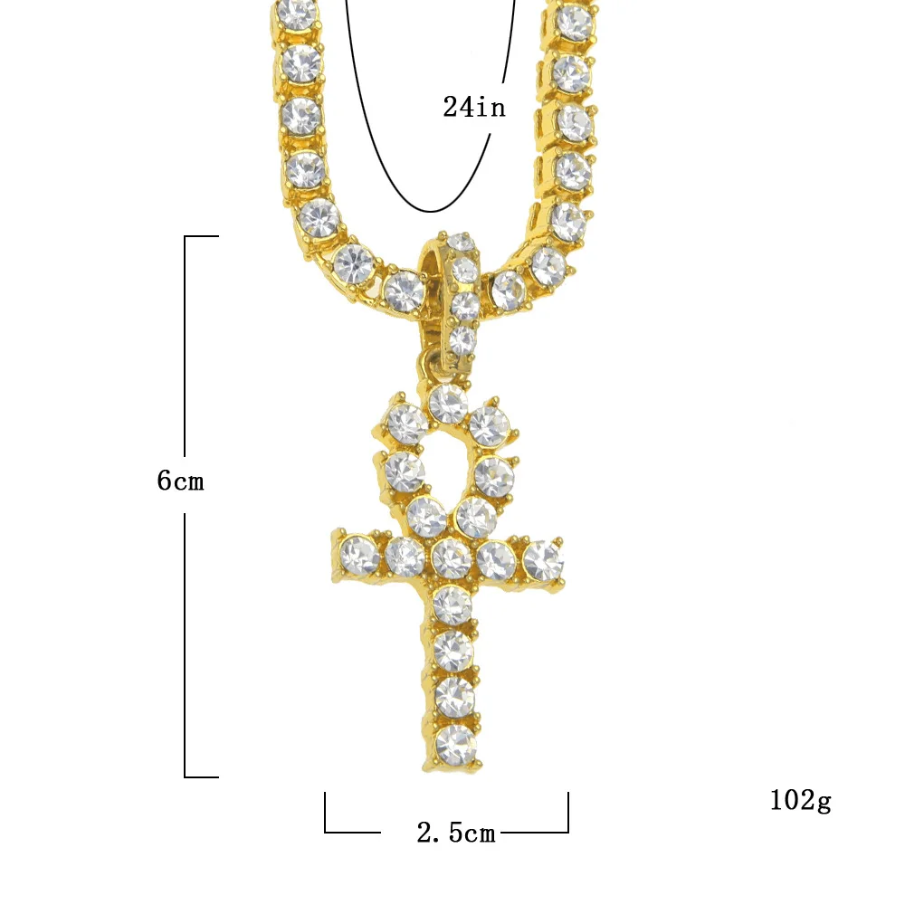 Promo Hip Hop Bling Ice Out Rhinestone Paved Ankh Cross Pendants Necklace with 1 Row 24inch Tennis Chain