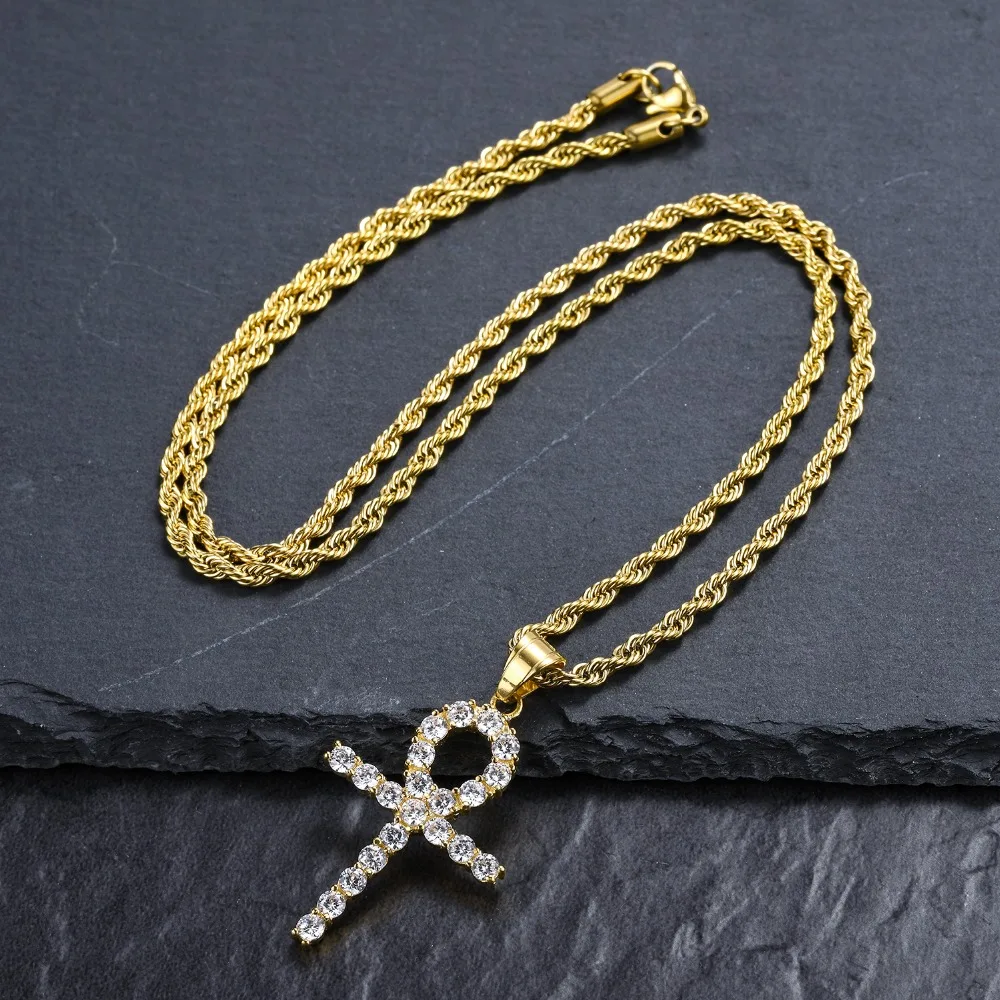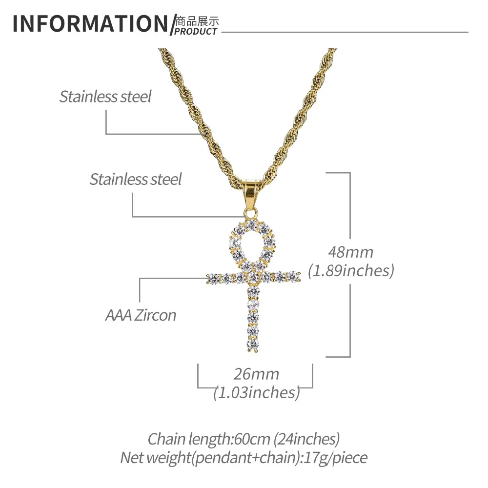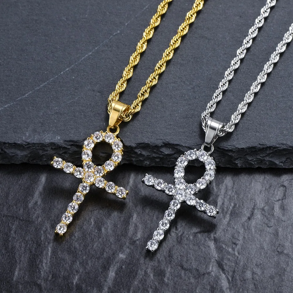 Promo Stainless Steel Hip Hop Bling Jewelry Golden Ankh Key Men Necklaces Women Charm AAA Zircon Rhinesto