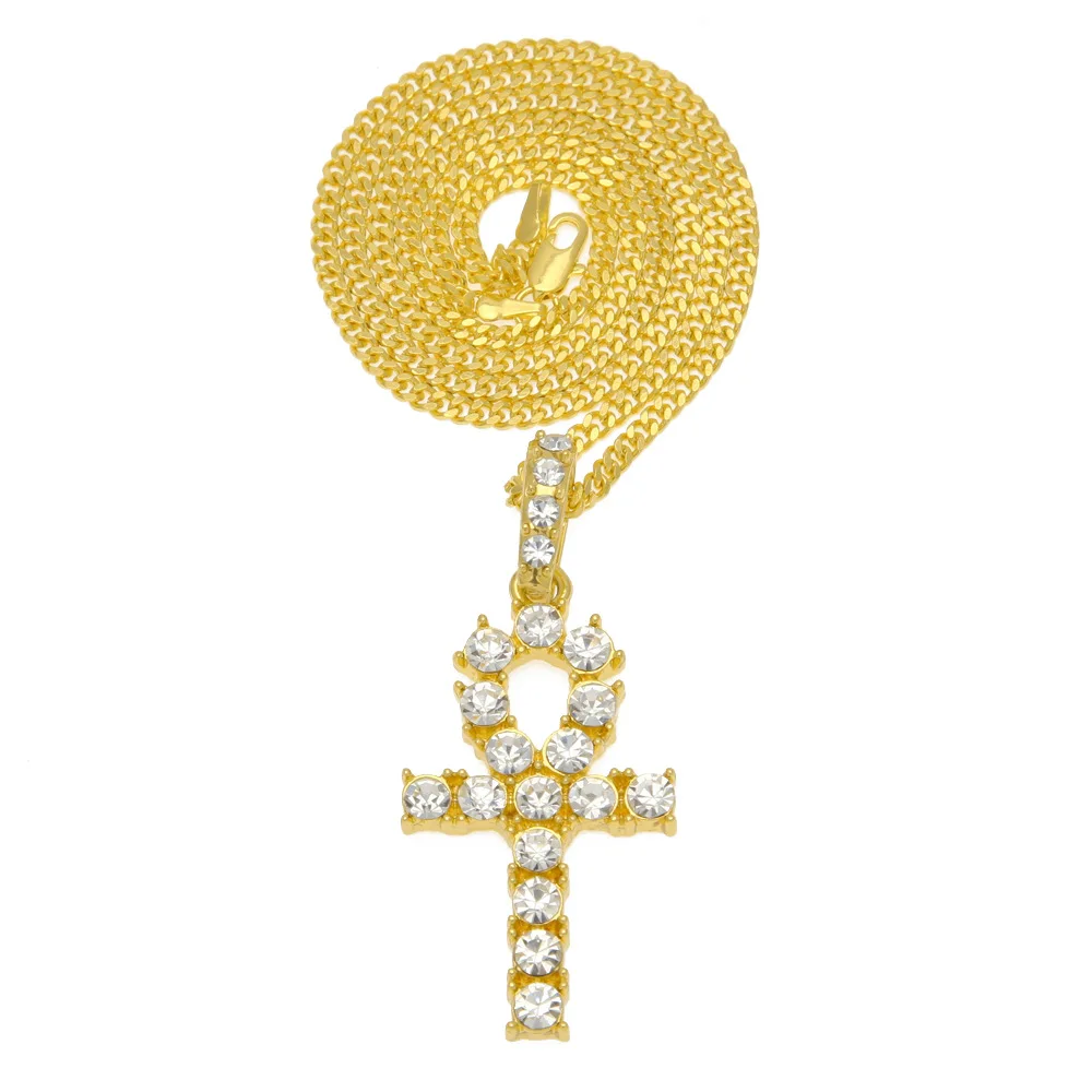 New Egyptian Ankh Key Of Life Pendant Necklace Bling Rhinestones Iced out and Cuban Link chain For Mens