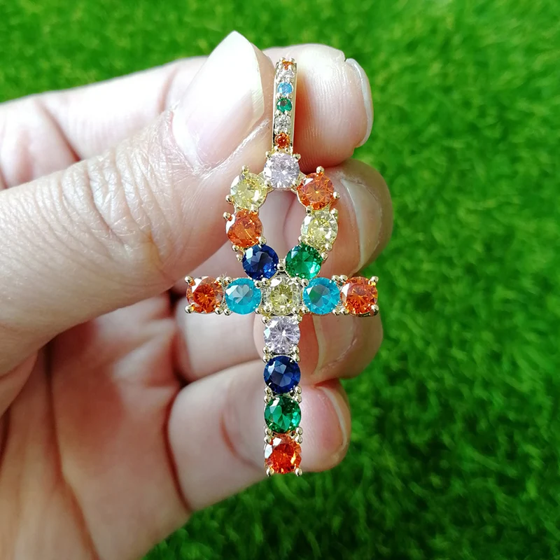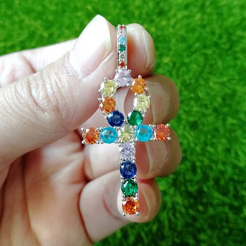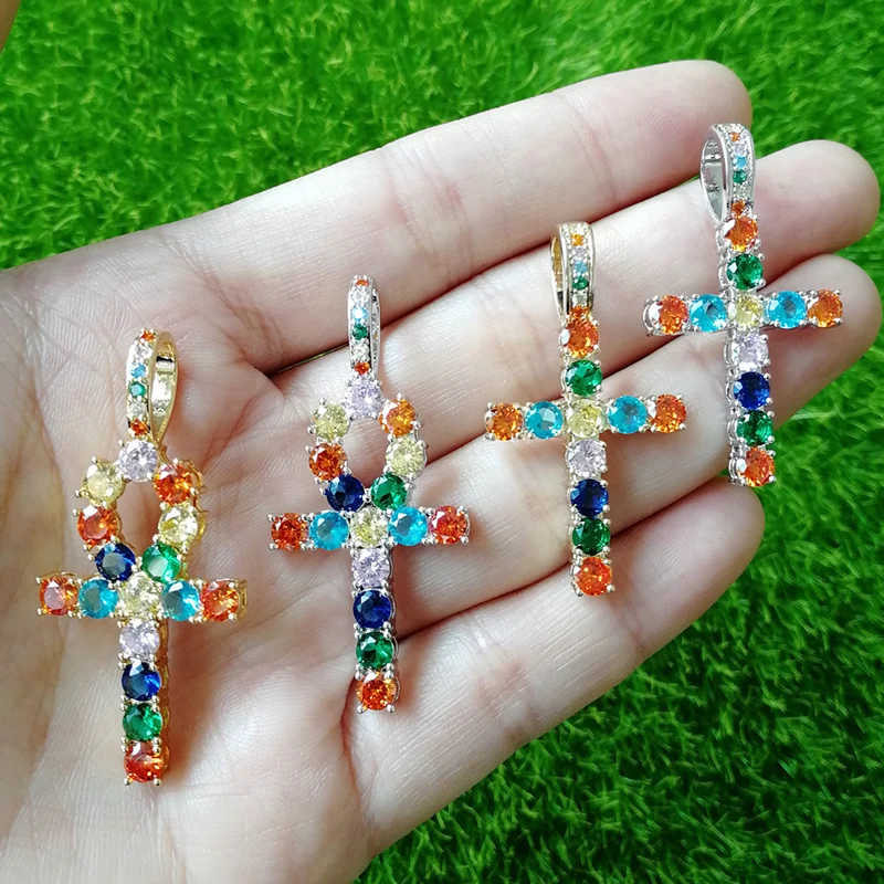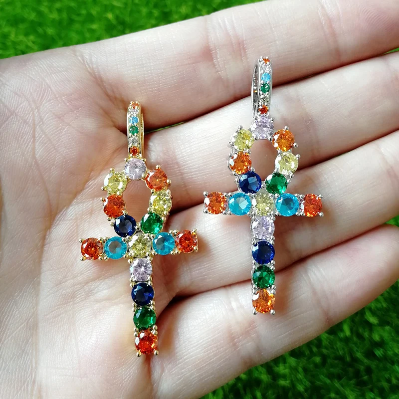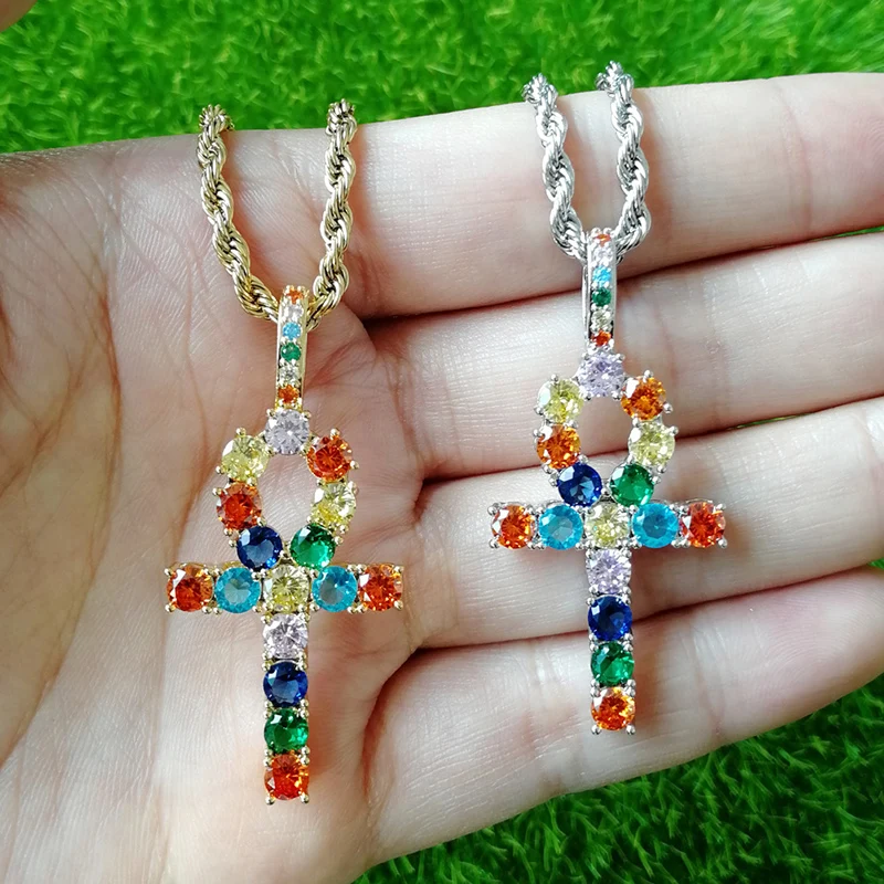 New Claw Inlay Multicolor CZ Zircon Stone Bling Ice Out Life Key Ankh Cross Pendants Necklaces for Men