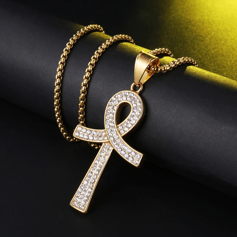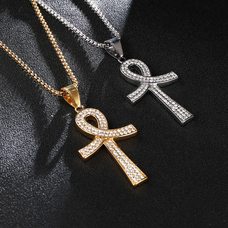 New D&Z Bling Full Crystal Ankh Cross Pendant Necklace Egyptian The Key of The Nile Collier For Men Hip