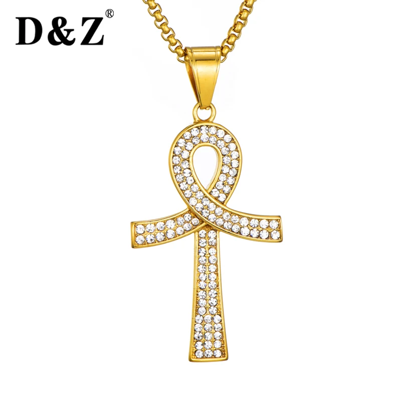 Best D&Z Bling Full Crystal Ankh Cross Pendant Necklace Egyptian The Key of The Nile Collier For Men Hip