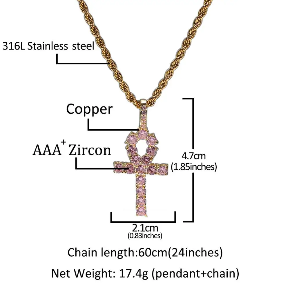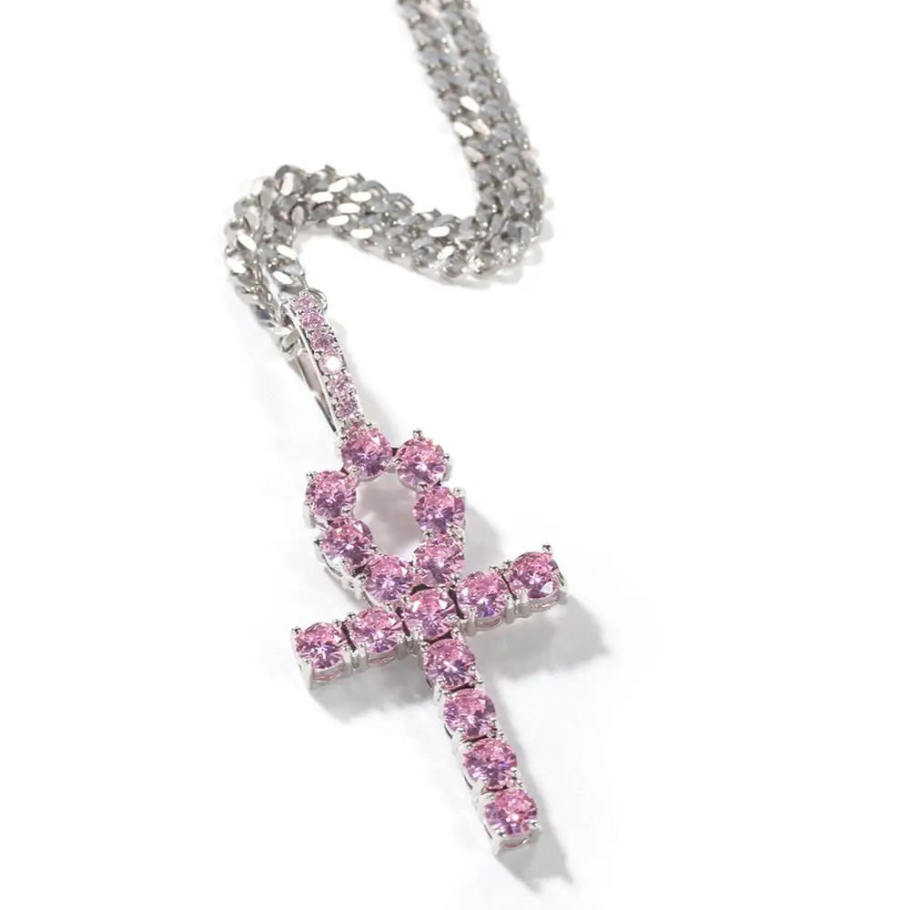 Buy Pink AAA CZ Zircon Paved Men Women Life Symbol Egyptian Ankh Cross Pendants Necklaces Male Hip Hop