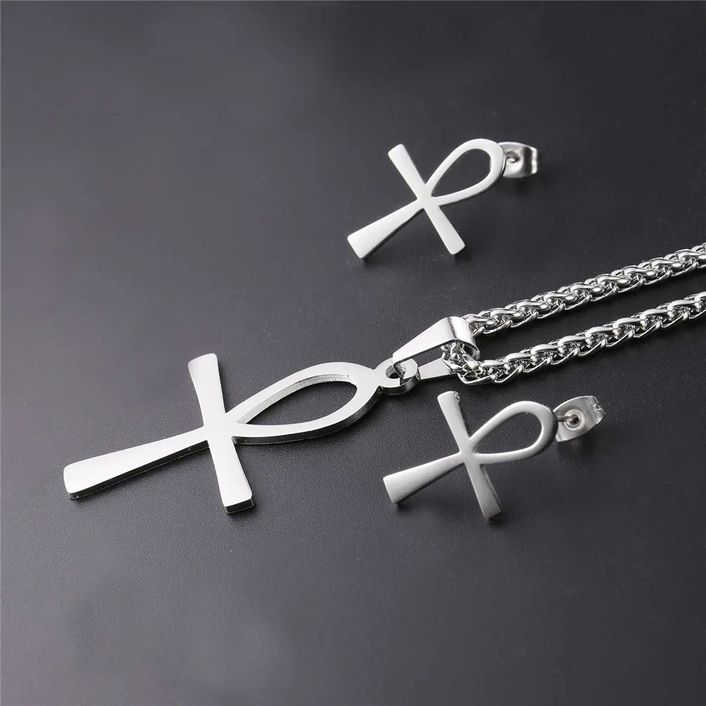 New Ankh/Crux Ansata Cross Key of the Nile Necklace&Stud Earrings Stainless Steel/Gold Color Egyptian S